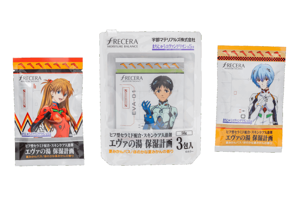 ・まちエヴァと宇部マテリアルズのコラボ商品、エヴァの湯。ほんのり夏みかんの香りと湯色でバスタイムををお楽しみください。