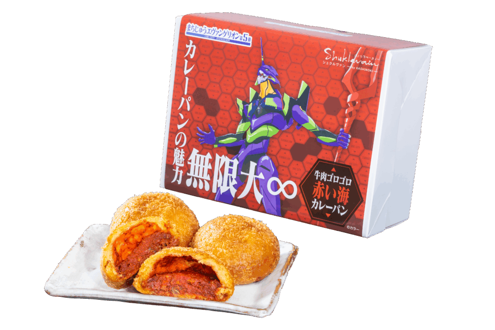 ・店舗で一番の人気商品である「牛肉ゴロゴロ黄金カレーパン」の中のカレールゥを赤くすることで、エヴァンゲリオンの赤い海を表現したカレーパン。牛肉をワインやスパイスで一晩漬けこみ、最後にじっくり煮込んで完成するまで2日間かけて作る自家製のカレールゥを使用。生地にもカレースパイスを練り込むことで、カレーの味を最大限味わえるようにしています。