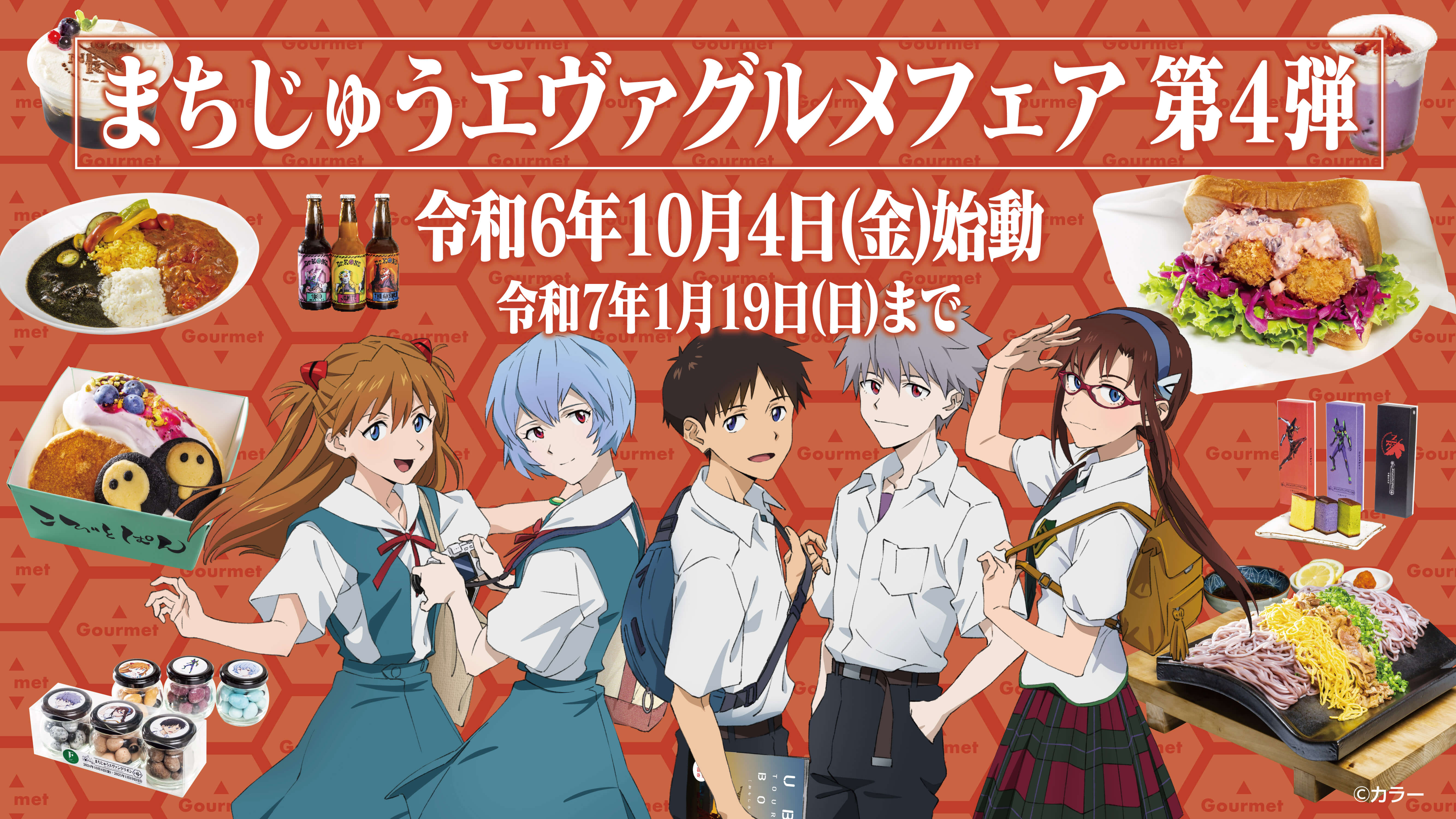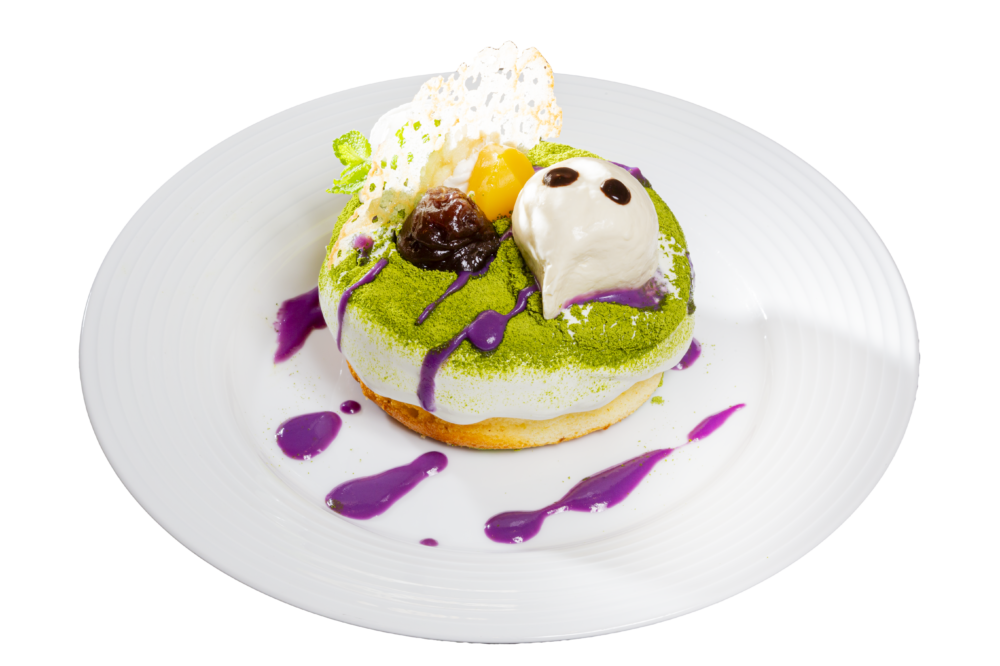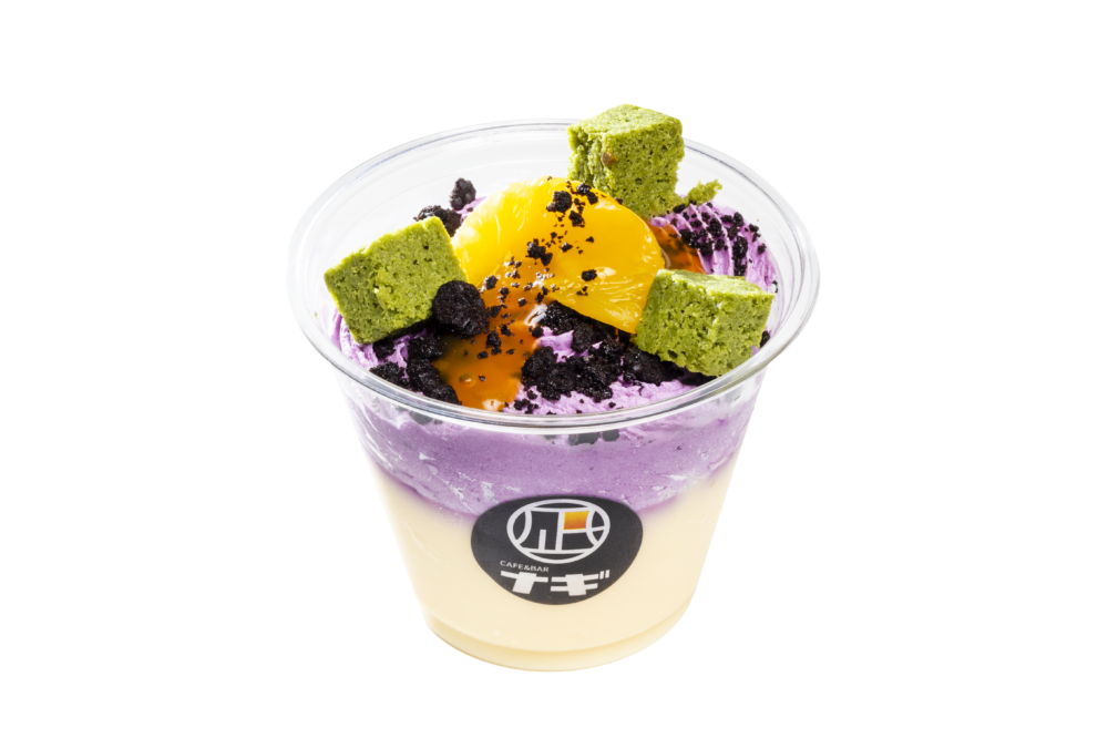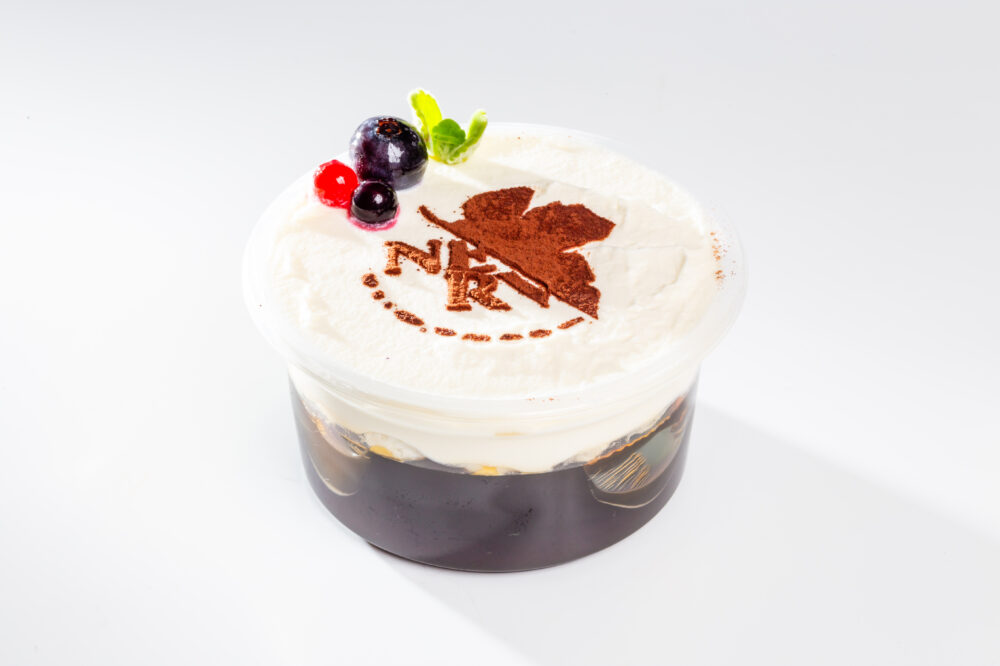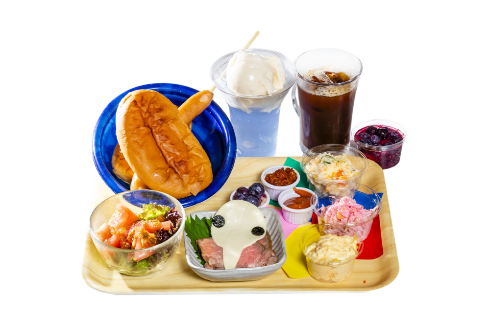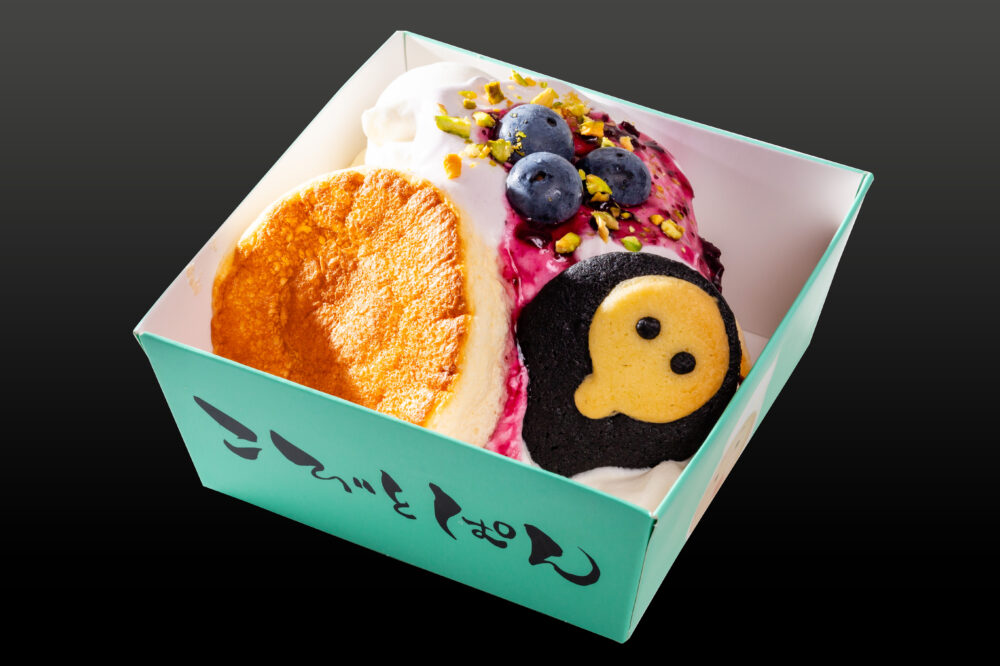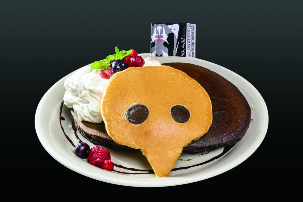 ・ふんわりと焼き上げた"宇部産竹炭パウダー"入りココアパンケーキに、たっぷりのホイップクリーム、カシスベリーアイス、第4使徒の似顔絵パンケーキをトッピングしています。オリジナルフラッグ付き!( ※ いずれの商品もテイクアウト可能です)