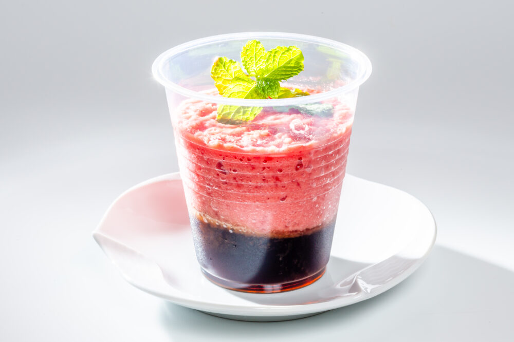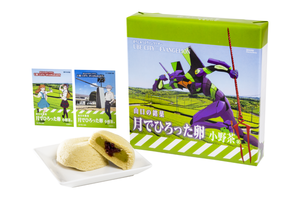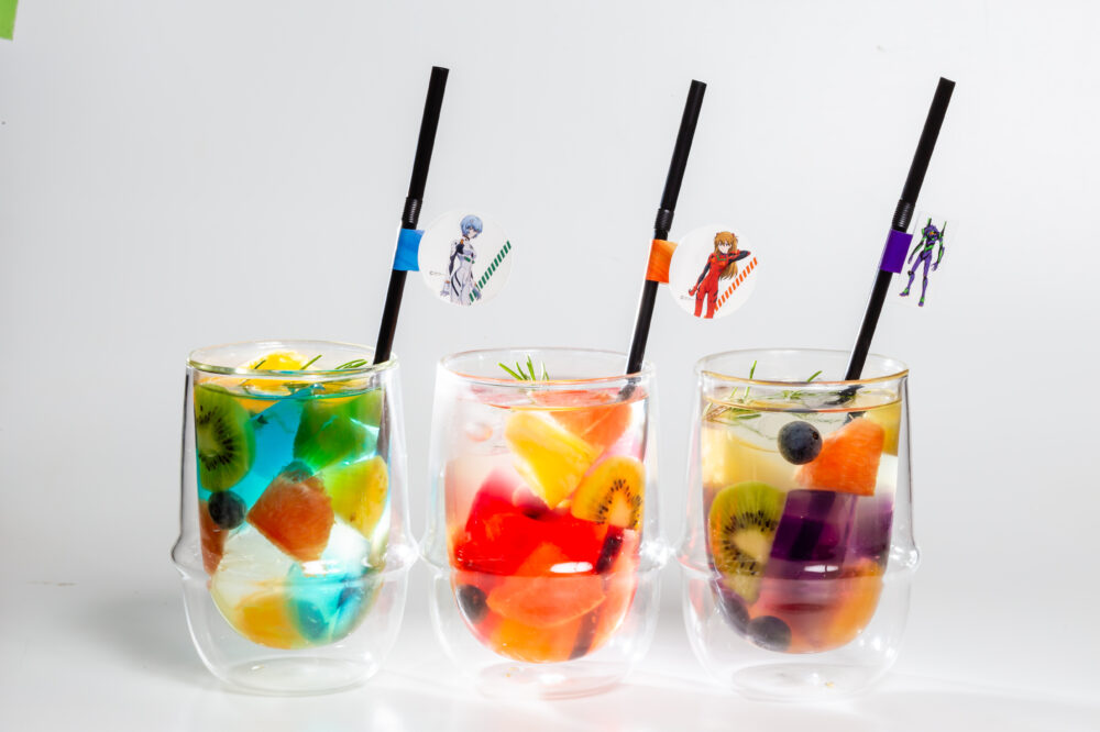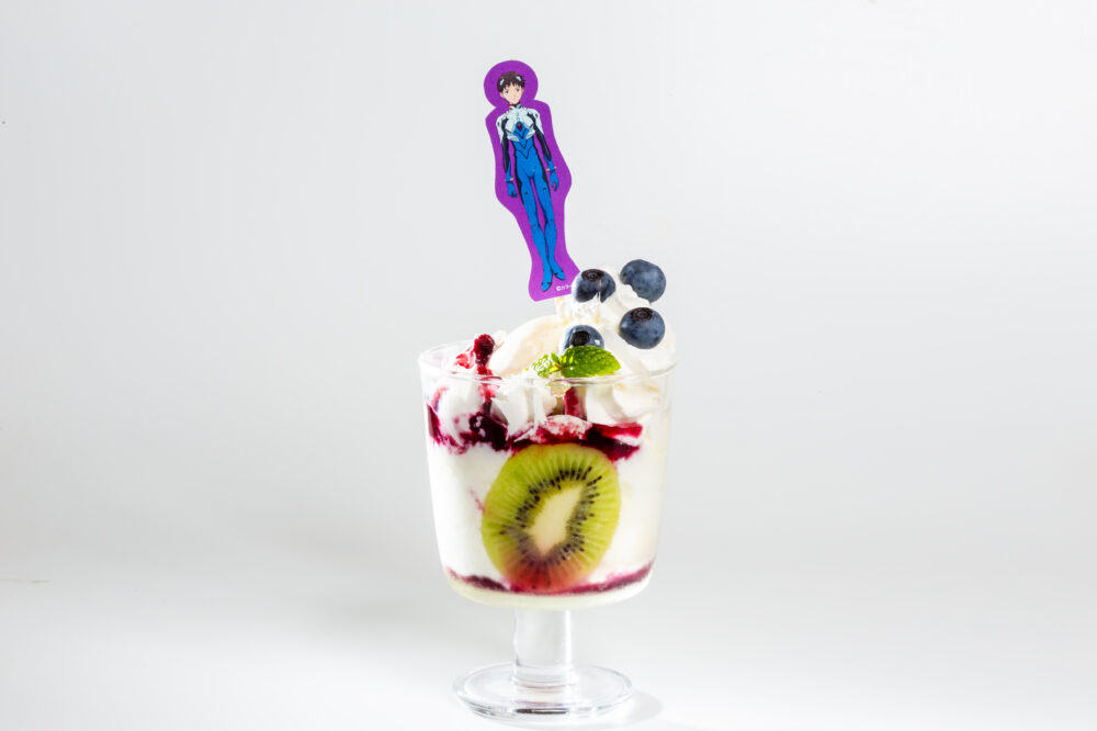 ・アスカの赤のゼリーで、初号機を紫色のゼリーで、レイを水色のゼリーでイメージしました。中には宇部産のブルーベリーや季節のフルーツを凍らせたものが入っています。