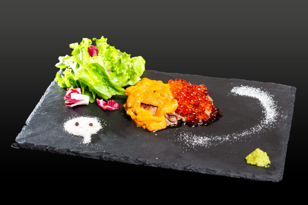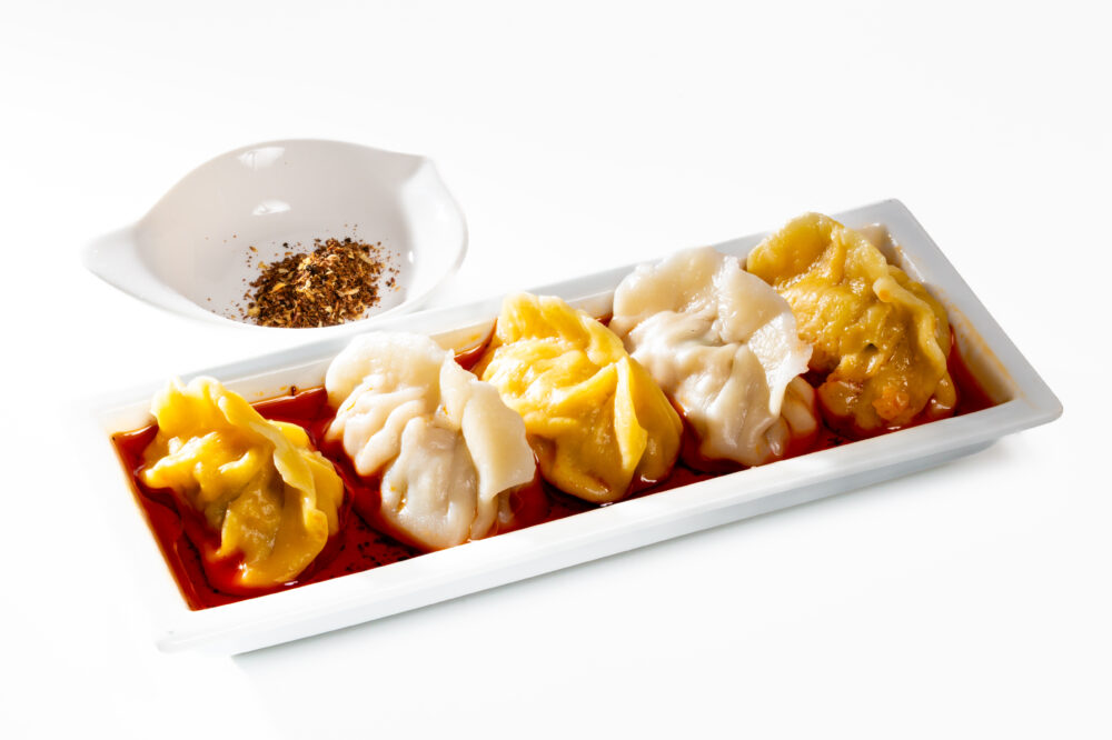 ・2号機をイメージして水餃子で表現しました。手作り生地で歯ごたえがあり、黄色餃子皮はかぼちゃから作り、健康的です。具は豚肉、白菜、ニラの組み合わせで、本場中華の四川風マーラー(辛い)タレに付け、ぜひご堪能ください。中華山椒粉添えで途中味変も楽しんでください。