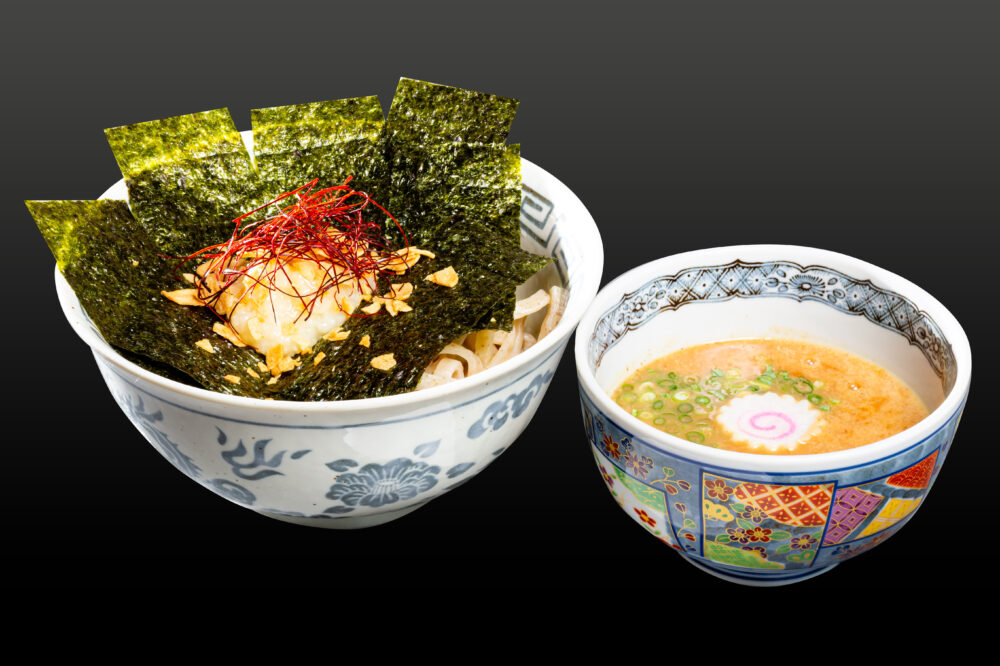 ・らうす昆布、牛すじの出汁にオリジナルカレースパイスを加えた出汁に全米粉の細麺をビーツで赤くしています。使徒のチーズ・サワークリームと縄田海苔の味と宇部港のブトまたは赤エビのフライの香りを楽しんで下さい。