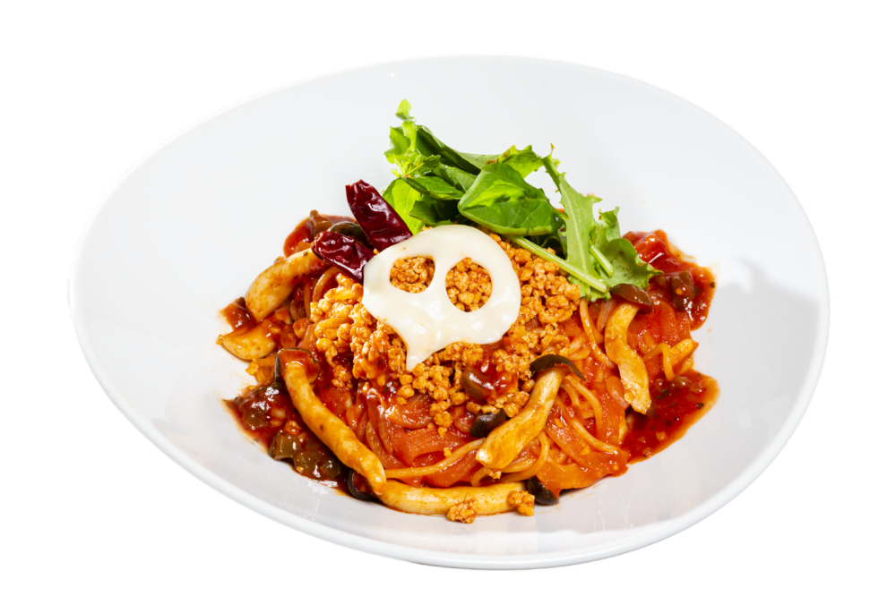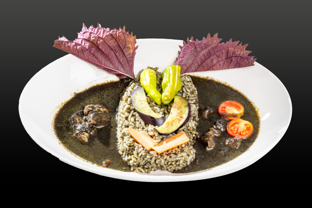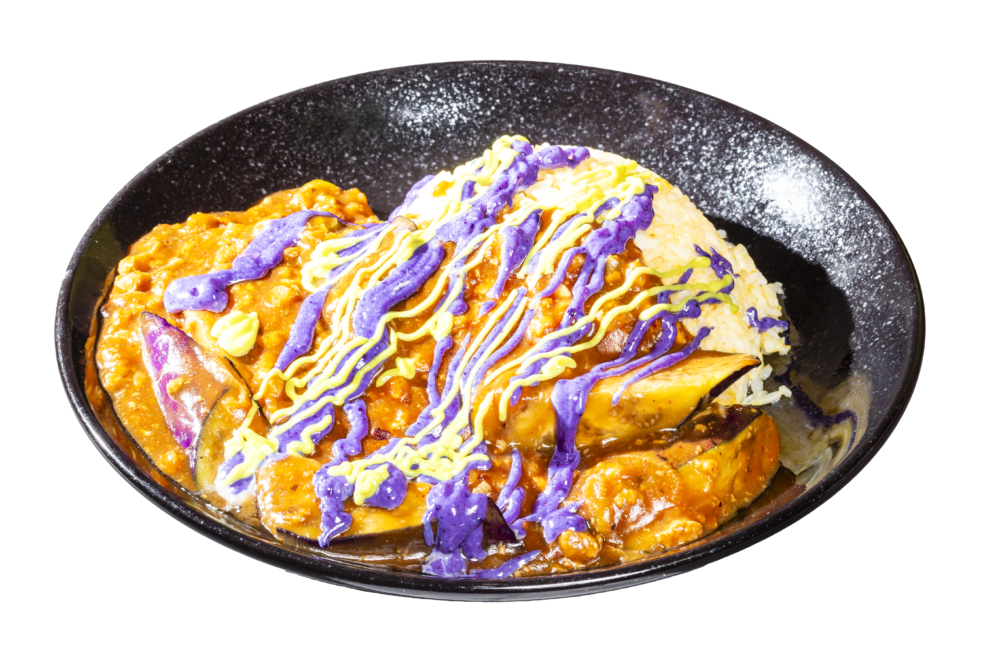 ・2号機とアスカをカレーで表現しました。石炭黒カレー、トマトベースのカレーのコントラストを楽しみながら召し上がり下さい。野菜はオーナー自家製の季節のものを使用しています。