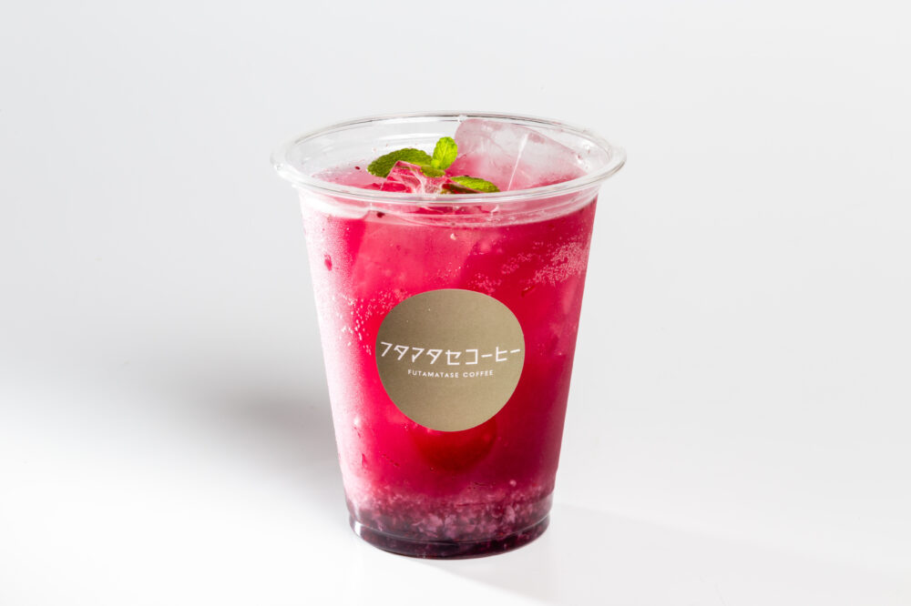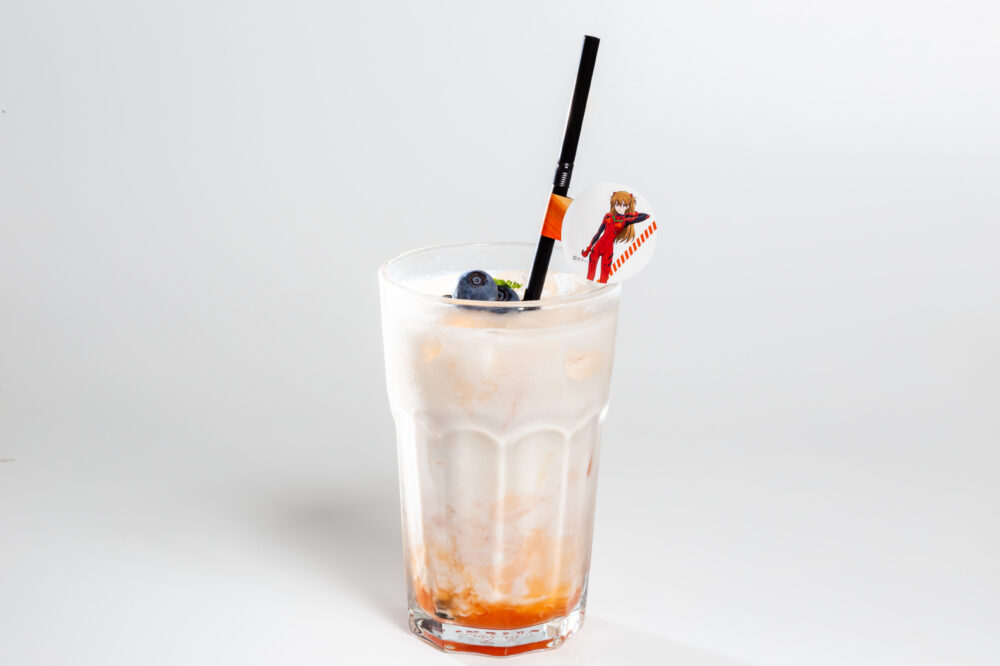 ・当店の人気ドリンク甘酒ひよりのスカッシュを初号機カラーにアレンジしました。ミックスベリーシロップ、自社製造の清涼飲料水「甘酒ひより」を使用しています。後口爽やかな味わいに仕上げています。