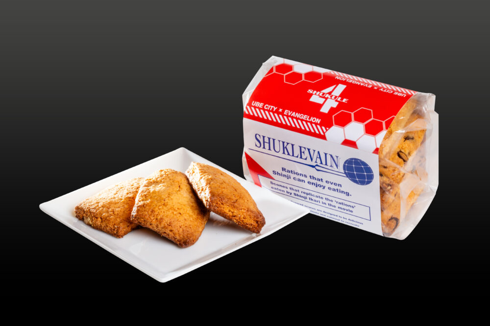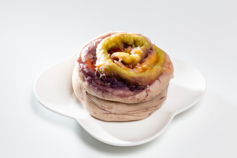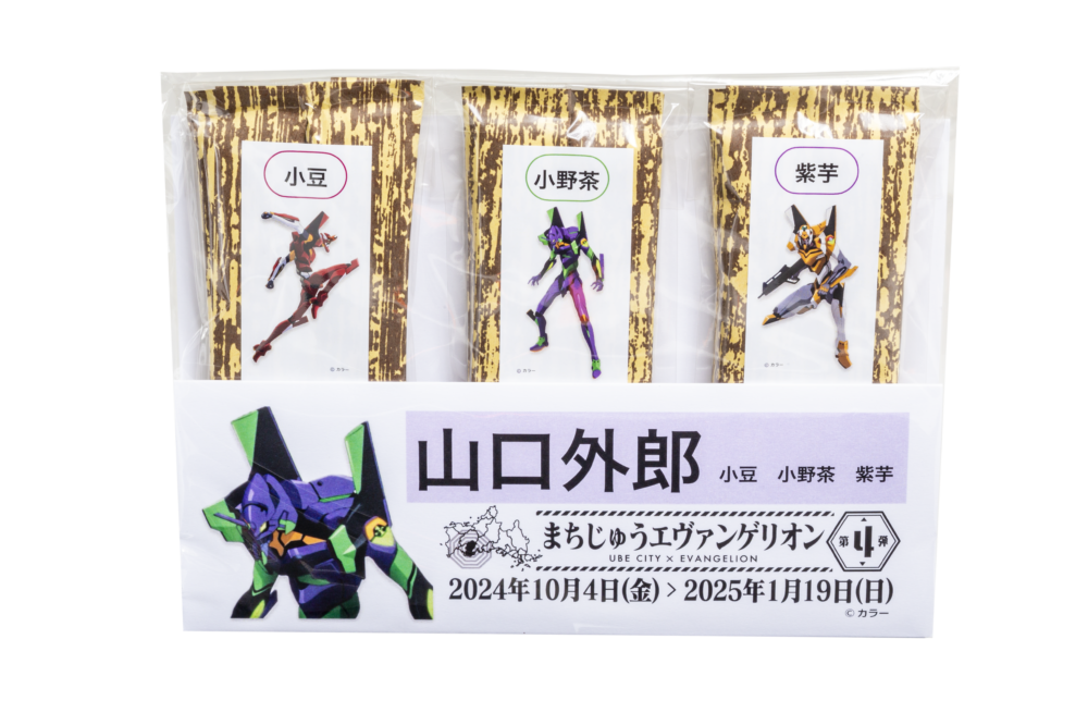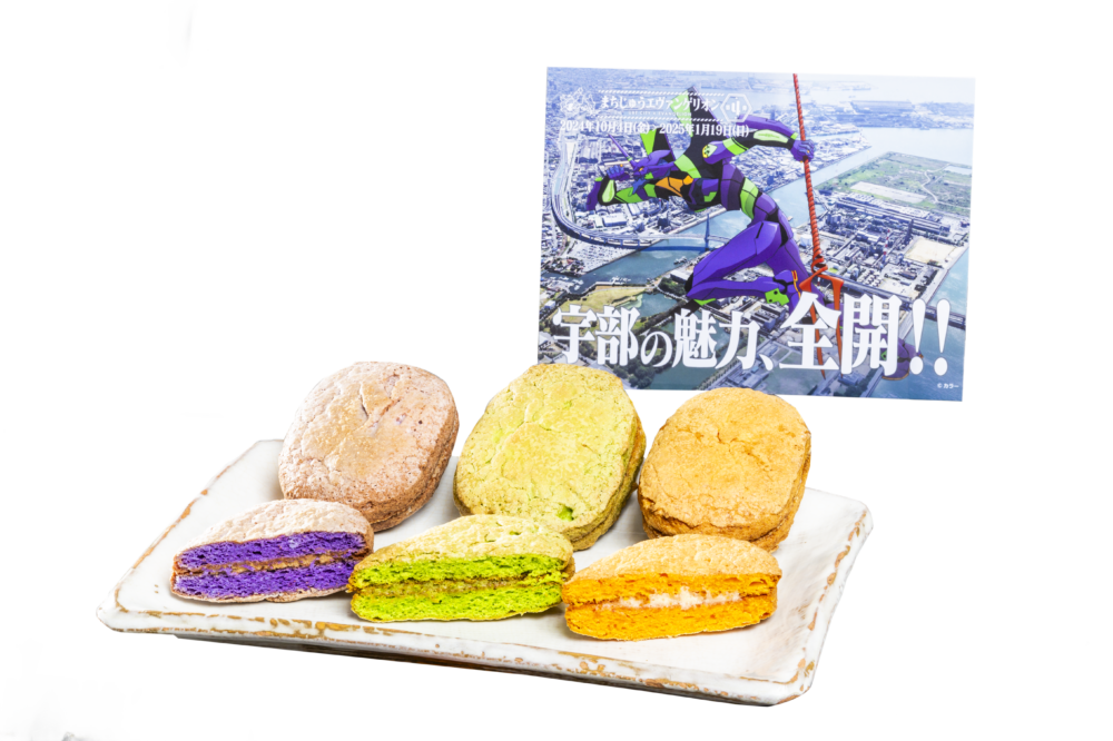 ・紫芋、お茶粉で生地を作り、初号機イメージを表現しました。手作りの紫芋あん、ドライフルーツ、チーズも挟んでいて豊かな味わいが口の中で広がります。1個130㌘前後のボリュームサイズで、たっぷりご堪能ください。