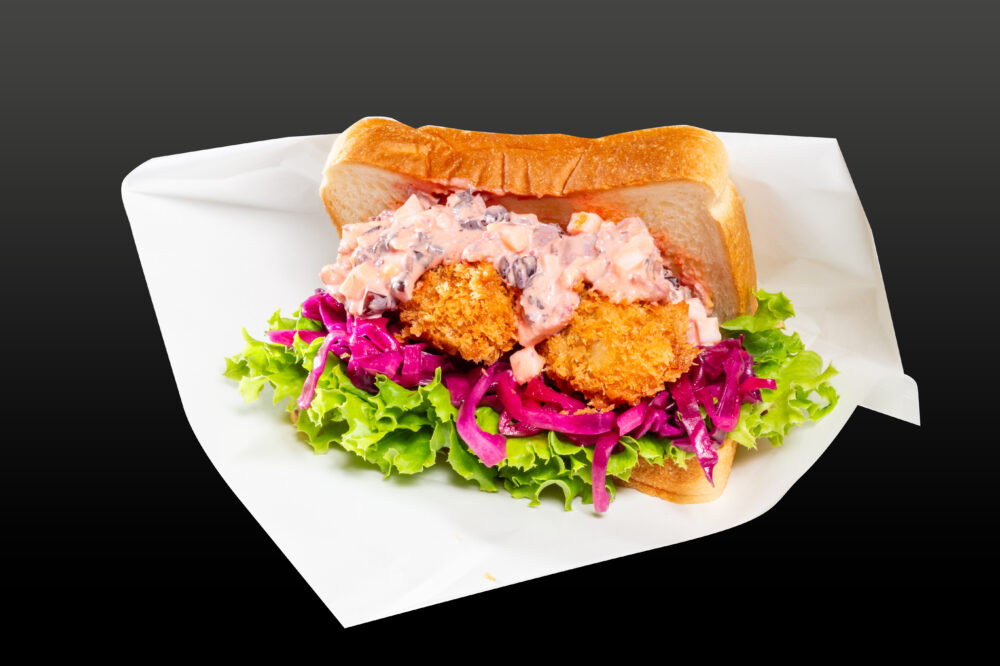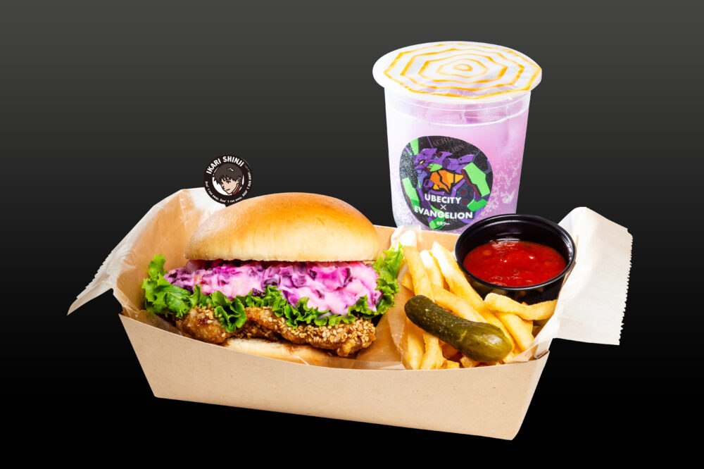 ・当店こだわりの「旨だれチキン」と、初号機をイメージした「特製柴漬けポテトサラダ」をフワフワバーガーバンズでサンドしました。宇部産竹炭パウダー入りの黒寒天/鮮やかな緑のメロンゼリー/炭酸グレープジュースで初号機をイメージしたドリンクとセットでどうぞ!