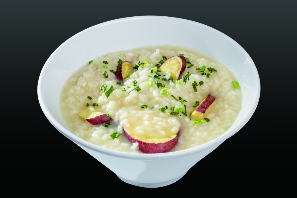 ・第3村の鈴原家で出されてレイが食べていたご飯を、宇部で昔から食べられていた郷土料理の茶粥で再現。宇部産の小野茶、お米、根菜を使用しています。