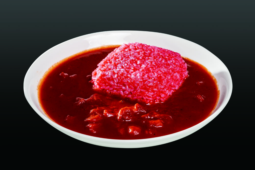 ・セカンドインパクトでコア化した海をイメージしたシーフードカレー。宇部産の季節の魚介で出汁をとりカレーに使用。ライスはニアサードインパクトで赤くなった大地をイメージして赤く炊いた宇部産のお米を使用しています。