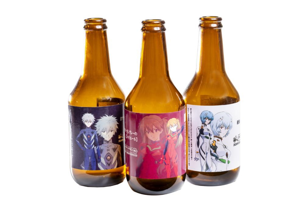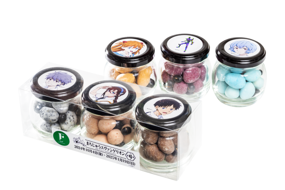 エヴァンゲリオンのキャラクターをイメージしたピーナッツの加工品です。各瓶には千葉県製造の加工豆と山口県豊田町産のんたぐろ(黒大豆のいり豆)を入れています。